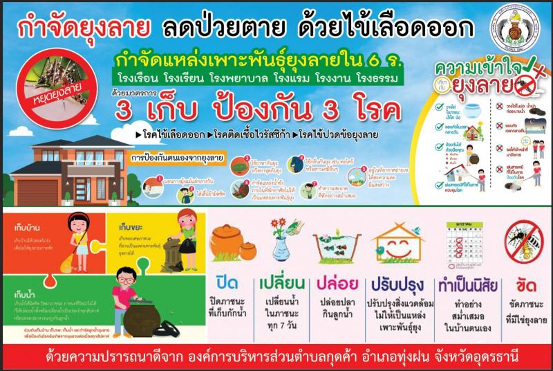 รายละเอียด : องค์การบริหารส่วนตำบลกุดค้า ขอความร่วมมือประชาชนในเขตพื้นที่ ช่วยกันกำจัดลูกน้ำยุงลายในภาชนะที่มีน้ำขังทุกสัปดาห์ เพื่อตัดวงจรการเกิดยุงลาย ซึ่งก่อให้เกิดโรคไข้เลือดออก โดยการรณรงค์ให้ประชาชนมีพฤติกรรมการเก็บ 3 เก็บ คือ "เก็บให้เกลี้ยงไม่เลี้ยงยุงลาย" และ "5 ป.ปราบยุงลาย "