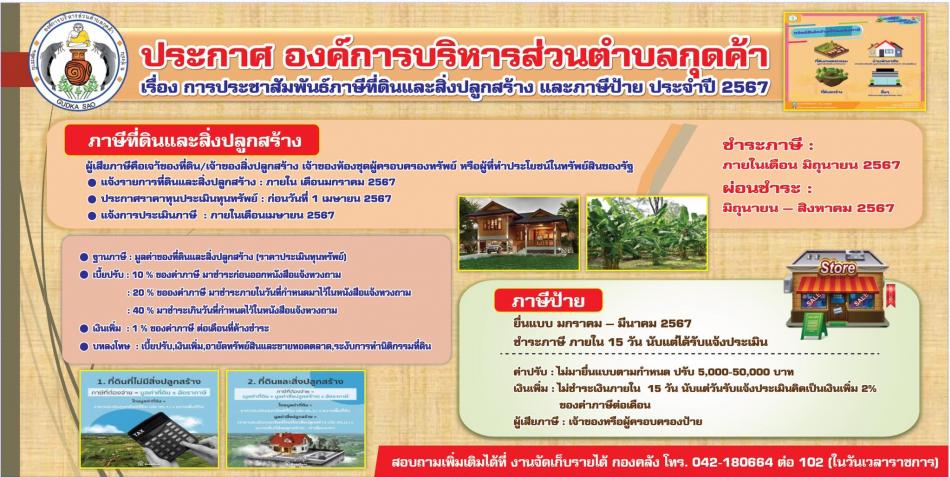 ประชาสัมพันธ์กำหนดการชำระภาษีที่ดินและสิ่งปลูกสร้างและภาษีป้ายประจำปี 2567 ภาษีที่ดินและสิ่งปลูกสร้าง กำหนดการ - แจ้งรายการที่ดินฯ ภายในเดือน ม.ค. 67 - ประกาศราคาทุนประเมินทุนทรัพย์ ก่อนวันที่ 1 เม.ย. 67 -... [1 มีนาคม 2567]