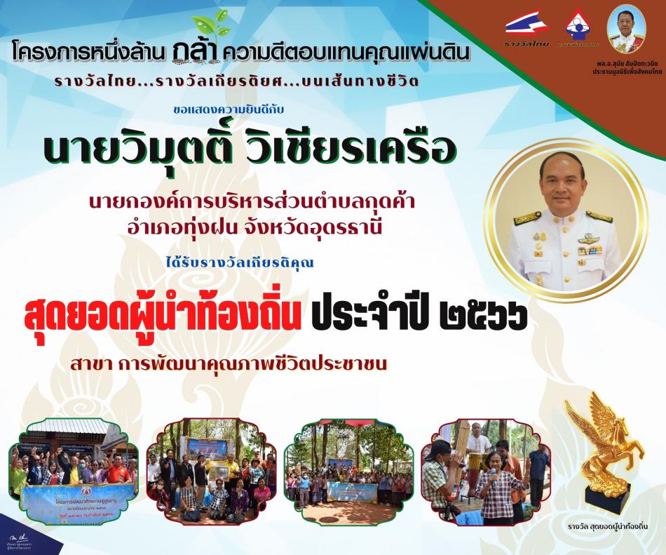 นายวิมุตติ์ วิเชียรเครือ นายกองค์การบริหารส่วนตำบลกุดค้า อำเภอทุ่งฝน จังหวัดอุดรธานี ได้รับการพิจารณาให้ได้รับรางวัลเกียรติคุณ รางวัล "สุดยอดผู้นำท้องถิ่น"ประจำปี 2566 สาขา การพัฒนาคุณภาพชีวิตประชาชน [2 มีนาคม 2566]